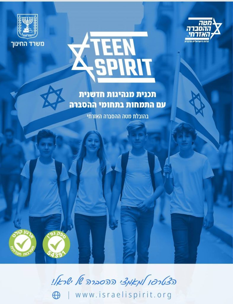 יצאנו לדרך! תכנית המנהיגות 'TEEN SPIRIT' מטעם 'מטה ההסברה אזרחי' היא מסע חינוכי ומרתק המשפיע לא רק על עומק ההבנה של הנוער על העולם, אלא גם על היכולת שלהם להתמודד עם אתגרים תרבותיים ולקדם שינוי בתפיסת ישראל. התכנית נוצרה במטרה להכשיר את בני ובנות הנוער להסביר את מדינת ישראל והמצב במזרח התיכון, לחשוף אותם לסוגיות חשובות בחברה ולעודד השתתפות פעילה במאמצי ההסברה. כמו כן, התכנית מהווה הכנה ליציאה למשלחות בחו"ל.